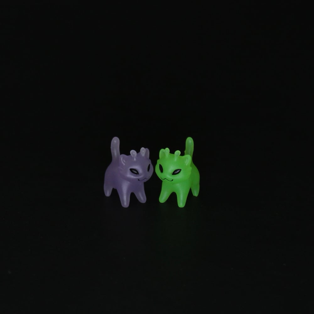 These little 3/4" tall Alien Kitties are 3d printed in photopolymer resin with hand-painted faces. Each little alien kitty guy comes in random-color UFO-themed packaging like the one pictured. They also glow in the dark!