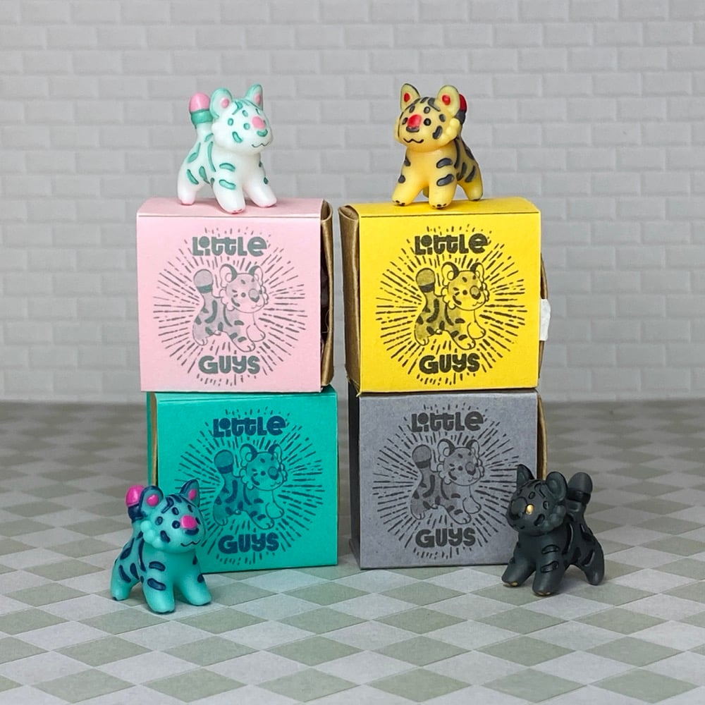 I wanted to make a new tiny tiger that was somewhere between a plain resin one and a fully painted one, and I was inspired by the painting style of the Jellybean Tiger action figure, thus the mini jellybean tigers were born! These tiny tigers are a mere 19mm tall, and 3d printed in photopolymer resin with hand-painted details.