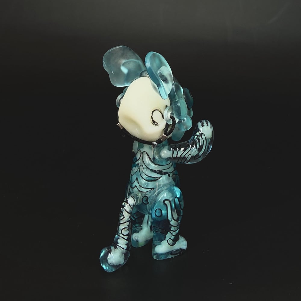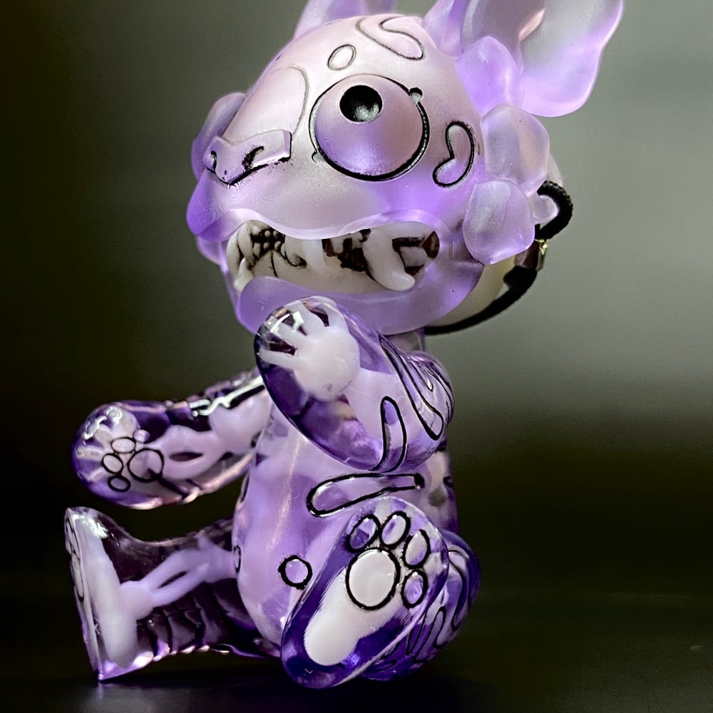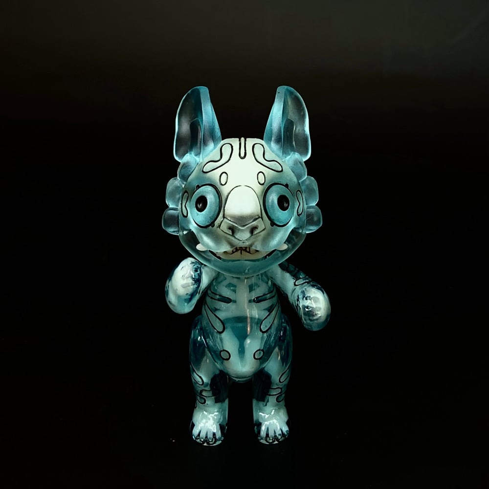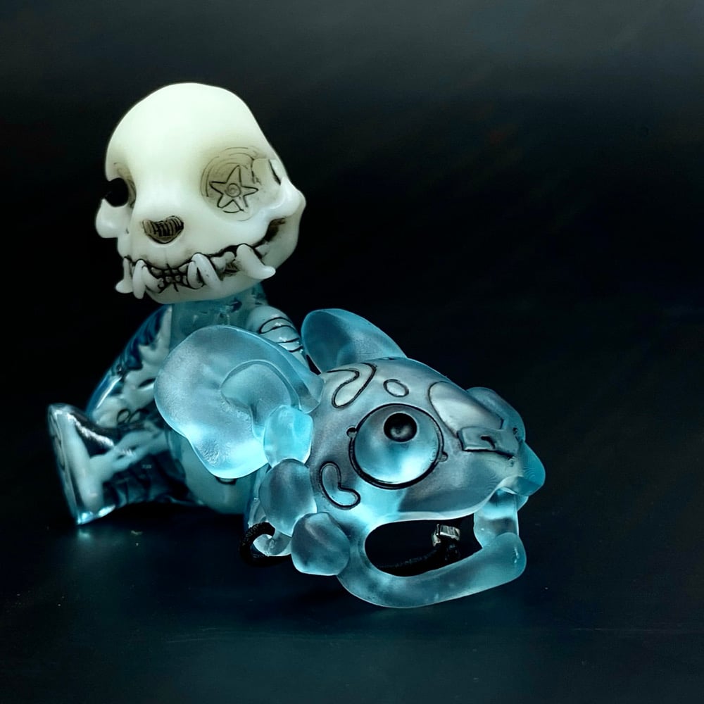 Skellybean is just under 3" tall, and is 3d printed in photopolymer resin with hand painted details. The skeleton is created by printing each piece with a skeleton-shaped void on the inside which is filled with glow in the dark resin and cured. Due to this unique process, there may be some small bubbles visible throughout the skeleton that were trapped when the resin cured.